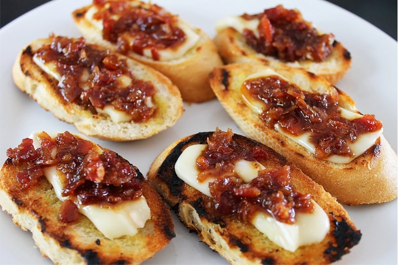 - Remove crostini slices from the oven and top with a slice of creamy brie cheese while still warm. Top with one tablespoon of the bourbon bacon jam and serve immediately.