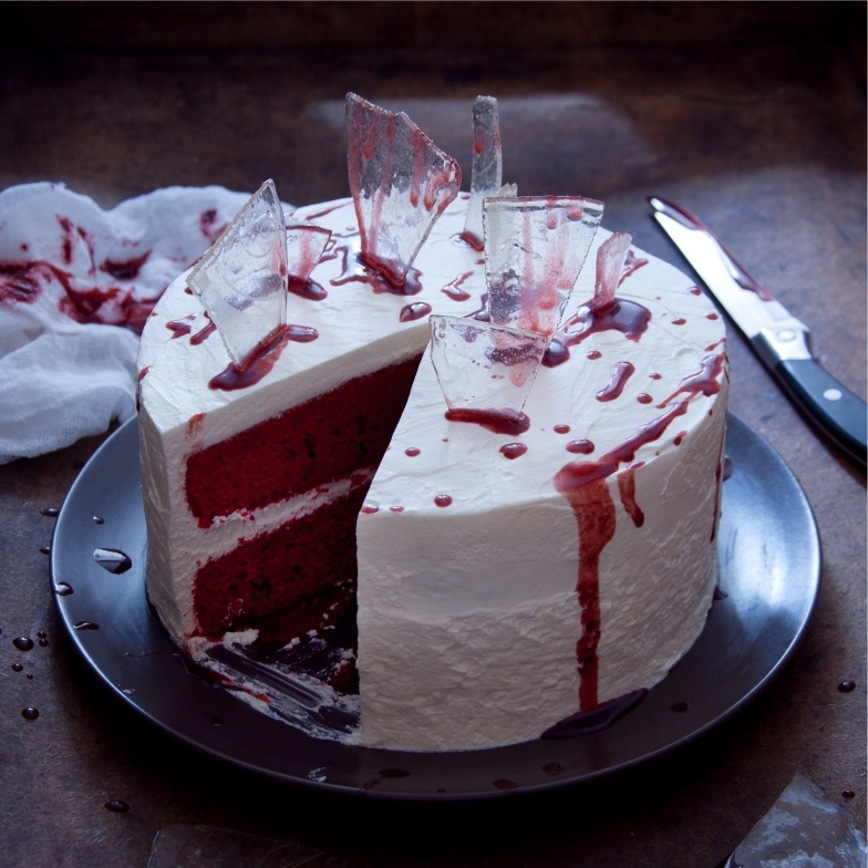 - Add splashes and drips of the raspberry “blood” around the frosted cake and the glass candy decorations to reach desired effect.