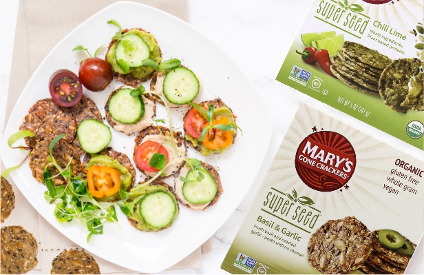 Try Mary’s Gone Crackers Basil and Garlic and Seaweed Sesame Superseed, Black Pepper, and Chili Lime Organic Gluten and Wheat Free Crackers.