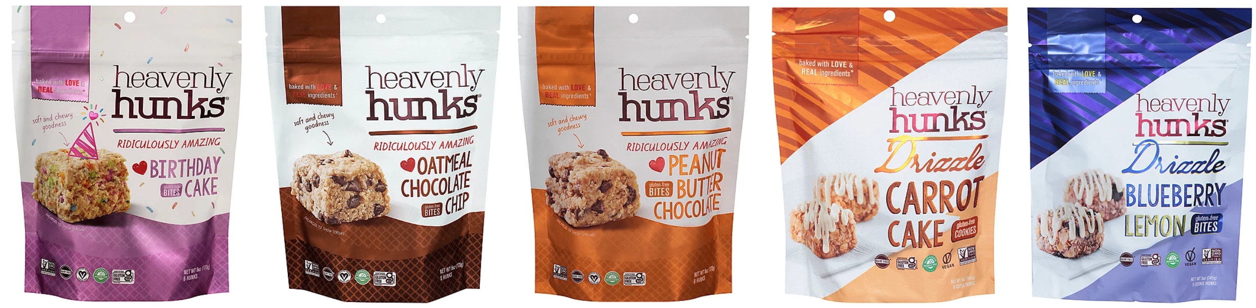 Heavenly Hunks creates indulgent, soft-baked cookie bites that feel like a treat but are made with thoughtful ingredients. Flavors like Blueberry Lemon Drizzle Cookie Bites, Carrot Cake Drizzle Cookie Bites, and Birthday Cake Bites bring bakery-style sweetness in snackable form. For chocolate lovers, Almond Butter Chocolate Chip Bites, Peanut Butter Chocolate Bites, and Oatmeal Chocolate Chip Bites offer rich, satisfying options that pair perfectly with coffee or an afternoon pick-me-up.